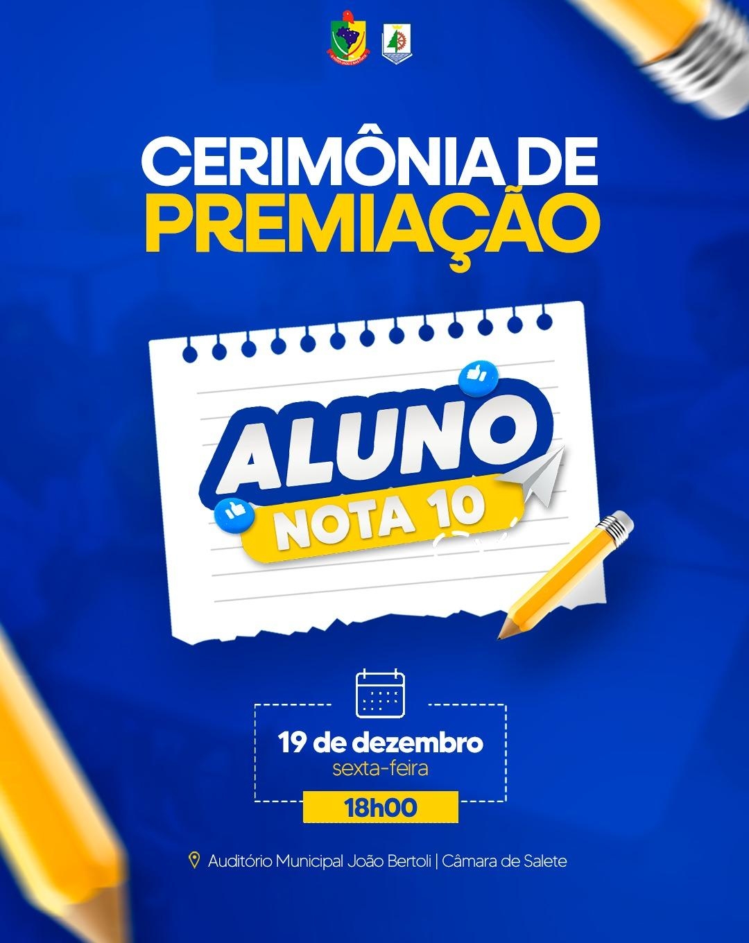 Nessa sexta-feira (19/12), às 18h00, o auditório da Câmara de Vereadores de Salete será palco de um momento especial: a Cerimônia de Premiação do Aluno Nota 10! Venha celebrar o esforço e a dedicação dos estudantes que se destacaram ao longo do ano. Sua presença fará toda a diferença!