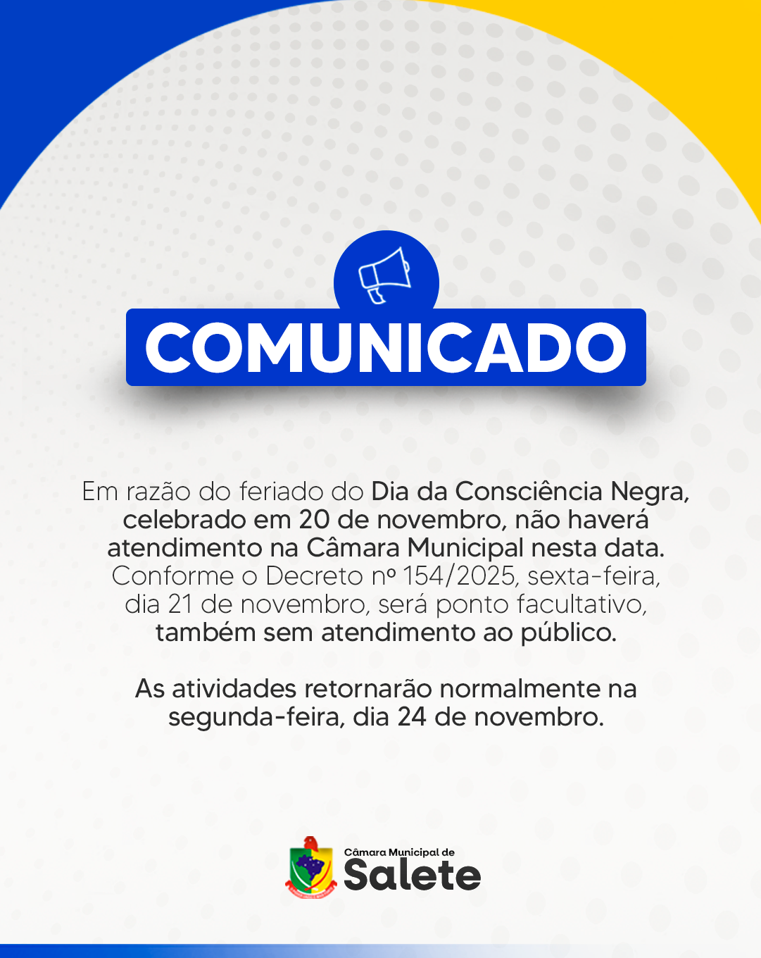 Em razão do feriado da Consciência Negra e do ponto facultativo, a Câmara estará fechada nos dias 20 e 21 de novembro.
