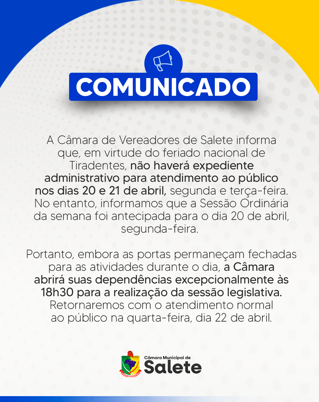 A Câmara Municipal de Salete convida a todos para a Sessão Ordinária, que será realizada hoje (03/03), às 18h30.